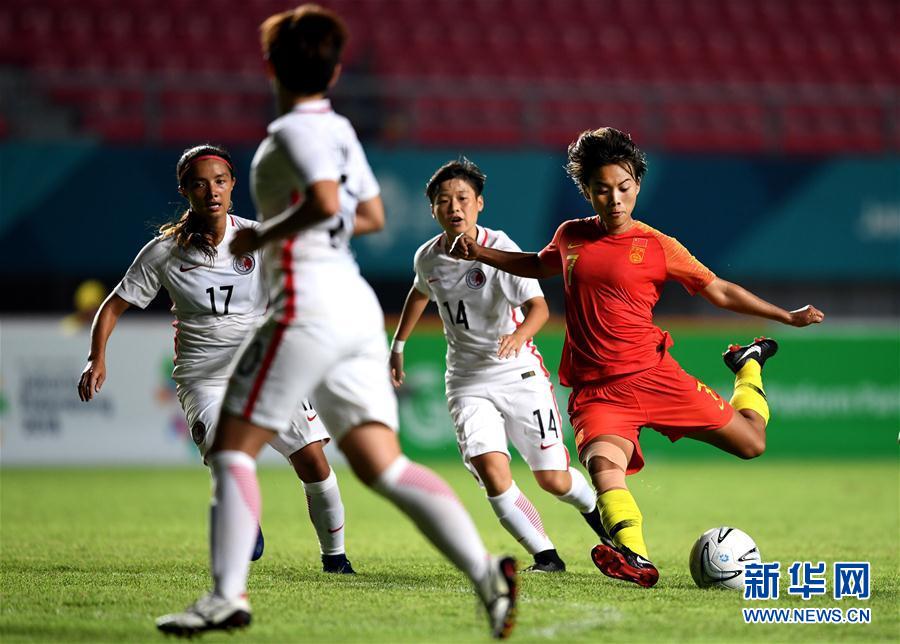 这是8月17日,中国女足队员王霜(右一)在第18届亚运会女足小组赛对阵中国香港队的比赛中射门。中国队以7比0战胜中国香港队。 新华社记者程敏摄