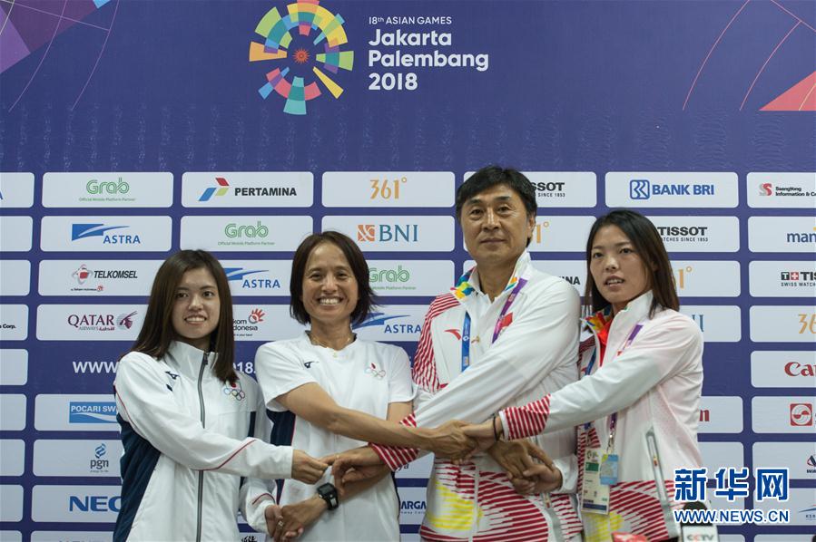 8月30日,中国女足主教练贾秀全(右二)、球员李梦雯(右一)和日本女足教练高仓麻子(左二)、球员长谷川唯在发布会上。 当日,在第18届亚运会女足决赛新闻发布会在印度尼西亚巨港举行。 新华社发(韦里摄)