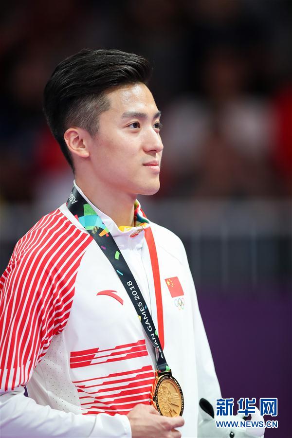 8月30日,中国选手董栋在颁奖仪式上。 当日,在第18届亚运会蹦床男子个人决赛中,中国选手董栋夺冠。 新华社记者丁汀摄