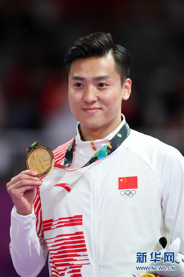 8月30日,中国选手董栋在颁奖仪式上。 当日,在第18届亚运会蹦床男子个人决赛中,中国选手董栋夺冠。 新华社记者丁汀摄