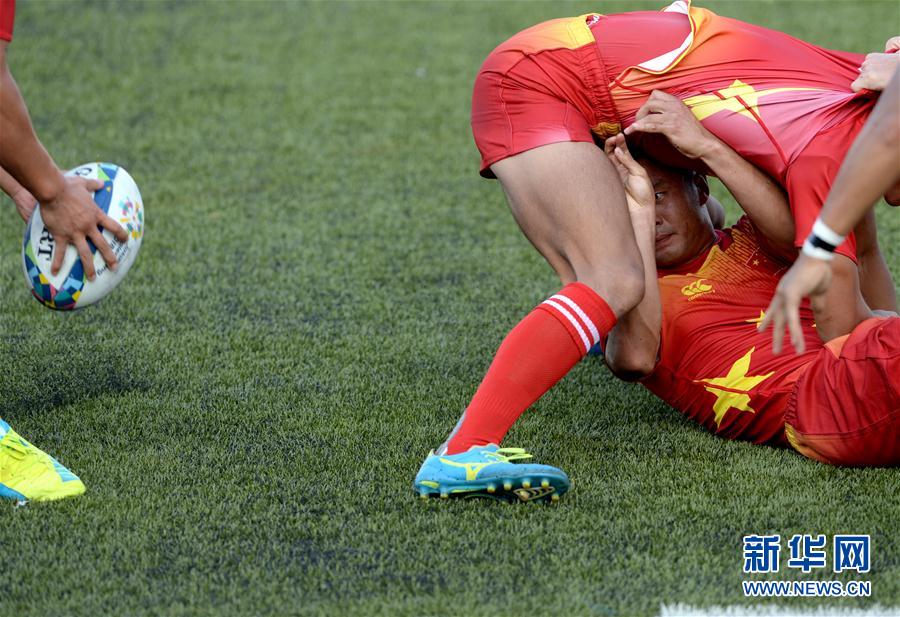 8月30日,中国选手刘鲁达(下)在比赛中。 当日,在第18届亚运会七人橄榄球小组赛中,中国队以17比42不敌中国香港队。 新华社发(阿贡摄)