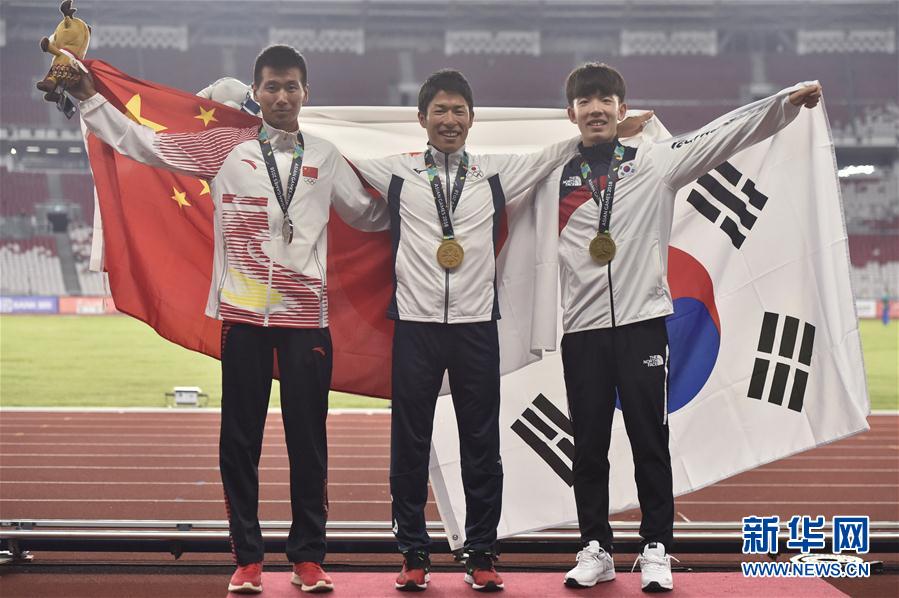 8月30日,冠军日本选手藤木隼人(中)、亚军中国选手王钦(左)和季军韩国选手朱贤明在颁奖仪式上。 当日,第18届亚运会田径男子50公里竞走颁奖仪式在雅加达举行。 新华社记者李贺摄