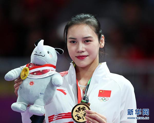 8月30日,中国选手刘灵玲在颁奖仪式上。 当日,在第18届亚运会蹦床女子个人决赛中,中国选手刘灵玲夺冠。 新华社记者丁汀摄