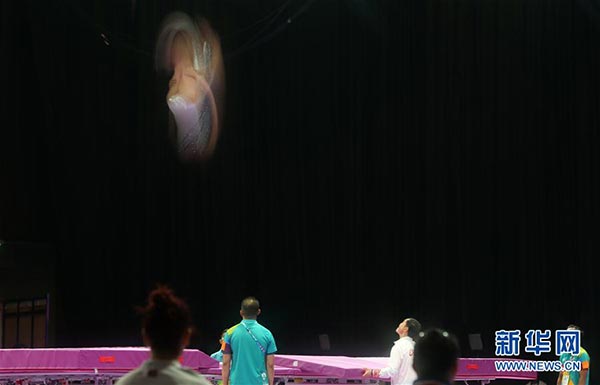 8月30日,中国选手刘灵玲在比赛中。 当日,在第18届亚运会蹦床女子个人决赛中,中国选手刘灵玲夺冠。 新华社记者丁汀摄