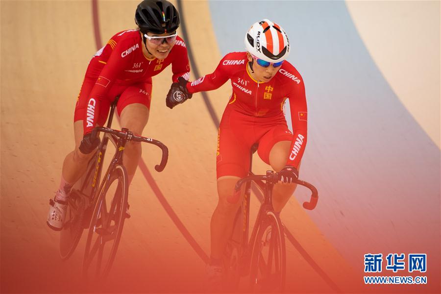 8月31日, 中国选手刘佳丽(左)和王笑飞在比赛后。 当日,在第18届亚运会场地自行车女子麦迪逊赛中,中国选手刘佳丽/王笑飞获得第三名。 新华社记者张金加摄
