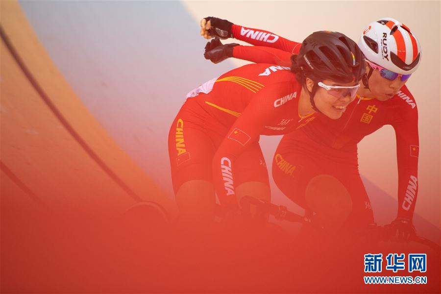 8月31日, 中国选手刘佳丽(左)和王笑飞在比赛后。 当日,在第18届亚运会场地自行车女子麦迪逊赛中,中国选手刘佳丽/王笑飞获得第三名。 新华社记者张金加摄