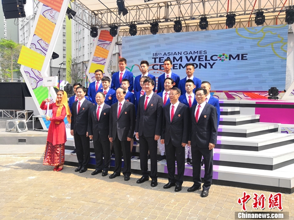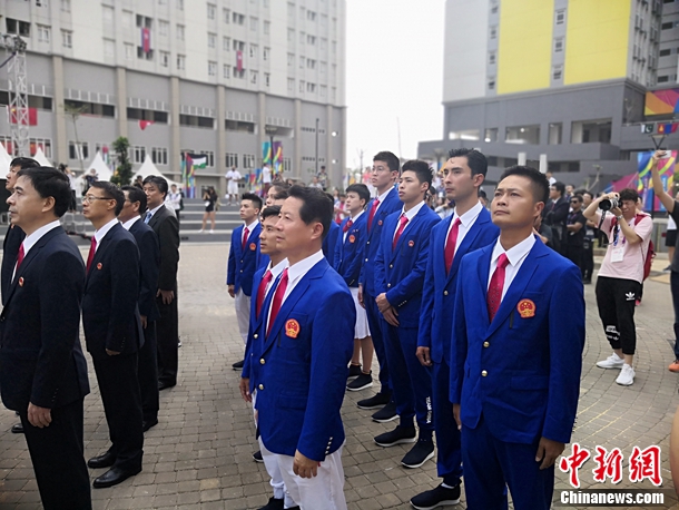 中新网客户端雅加达8月16日电(记者 岳川)第18届亚运会中国体育代表团升旗仪式于当地时间16日在亚运村升旗广场举行,肖若腾、华天等运动员参加了升旗仪式。