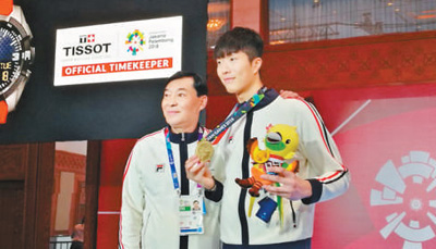 8月21日,中国香港队选手张家朗(右)与教练汪昌永在颁奖仪式后合影。
