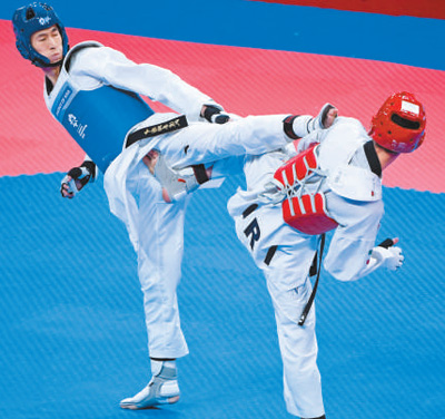 8月22日,中国队选手赵帅(左)在亚运会跆拳道男子63公斤以下级决赛中。