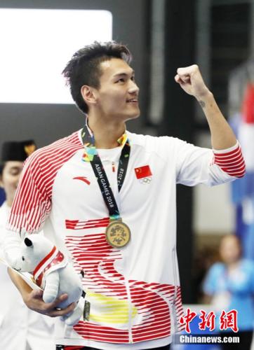 雅加达亚运会男子200米仰泳比赛,中国选手徐嘉余夺金。中新社记者 刘关关 摄