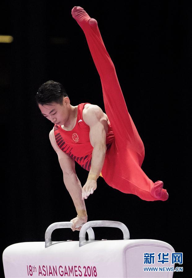 8月23日,中国选手邹敬园在比赛中。 当日,在印度尼西亚雅加达举行的第18届亚运会体操男子鞍马决赛中,中国台北选手李智凯获得金牌,中国队邹敬园,孙炜分获二三名。 新华社记者朱炜摄
