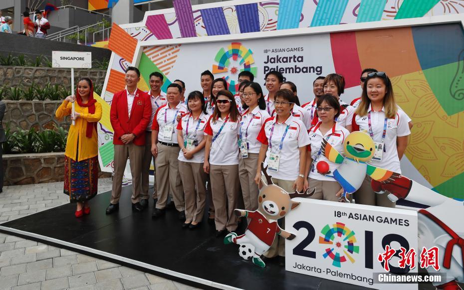 8月16日,第18届亚运会新加坡体育代表团升旗仪式在雅加达亚运村升旗广场举行。图为新加坡体育代表团合影。 中新社记者 杜洋 摄