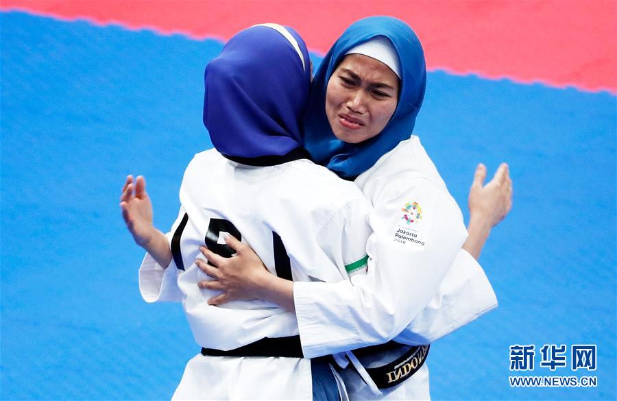8月19日,印度尼西亚选手德菲亚(右)在决赛后与伊朗选手马里安拥抱。 当日,在印度尼西亚雅加达举行的第18届亚运会跆拳道女子个人品势决赛中,印度尼西亚选手德菲亚战胜伊朗选手马里安,获得金牌。这是东道主印度尼西亚在本届亚运会获得的首枚金牌。 新华社记者王丽莉摄