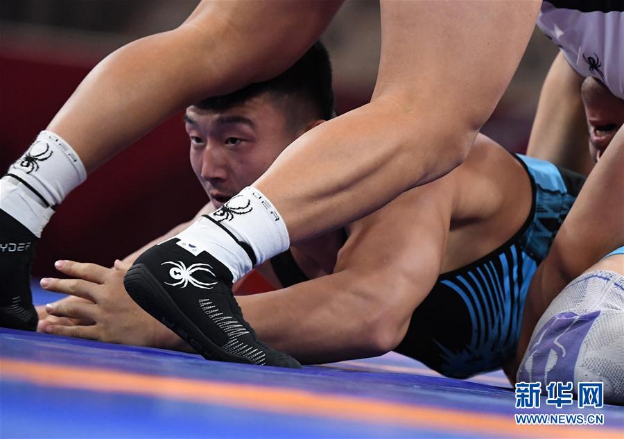 8月22日,中国选手肖棣(下)在比赛中。 当日,在第18届亚运会摔跤男子古典式97公斤级决赛中,中国选手肖棣以4比5不敌韩国选手赵孝哲(音译),获得银牌。 新华社记者李贺摄