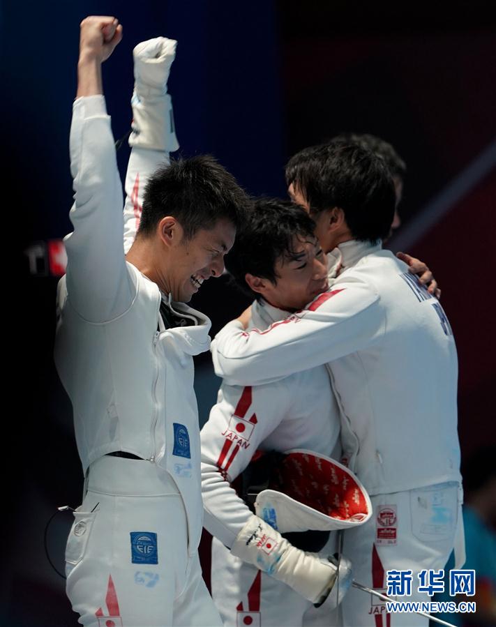 8月22日,日本队选手在获胜后庆祝。 当日,在印度尼西亚雅加达举行的第18届亚运会男子重剑团体决赛中,日本队夺冠,中国队亚军。 新华社记者王毓国摄