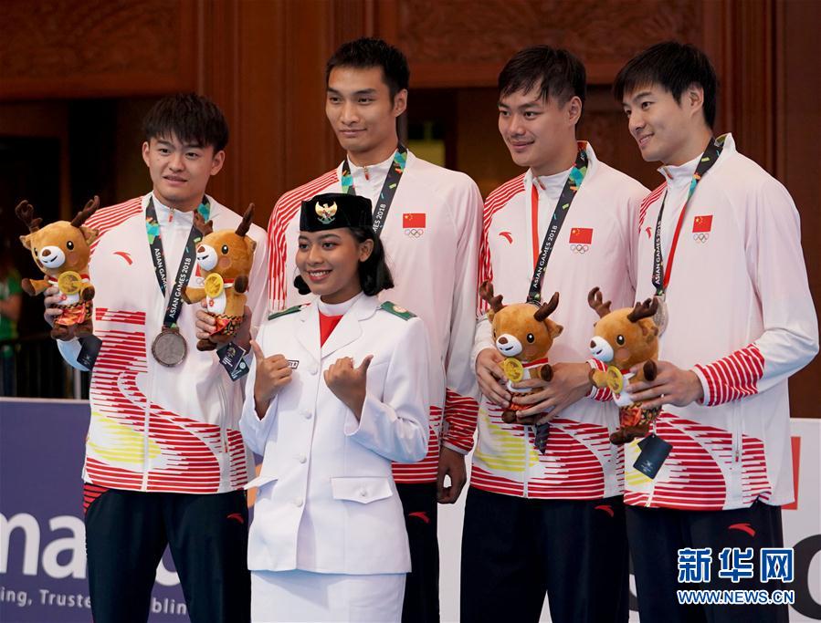 8月22日,获得亚军的中国队队员在领奖台上。 当日,在印度尼西亚雅加达举行的第18届亚运会男子重剑团体决赛中,日本队夺冠,中国队亚军。 新华社记者王毓国摄