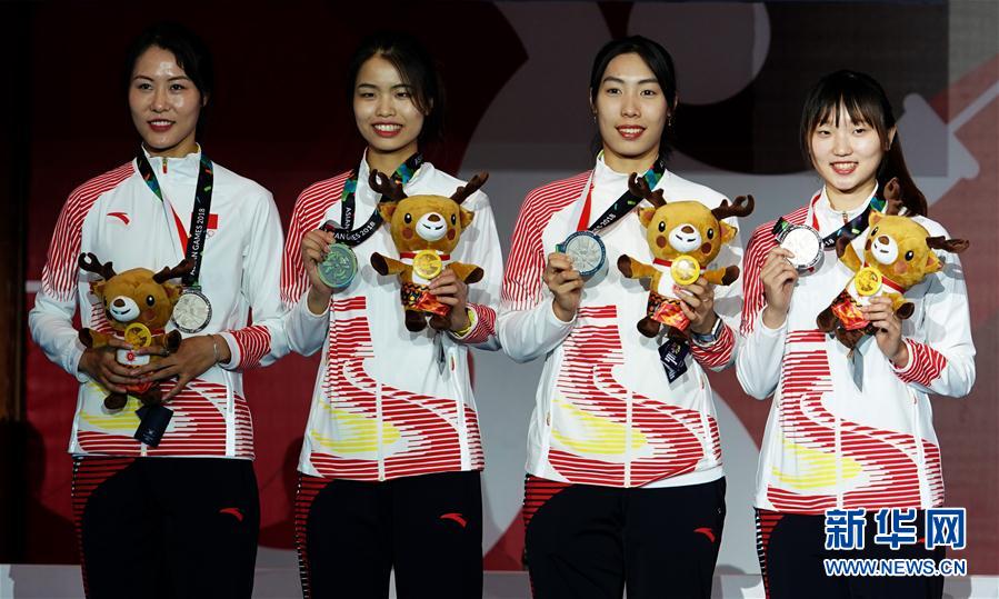 8月22日,中国队选手钱佳睿、杨恒郁、邵雅琦、和马婴佳(从左至右)在颁奖仪式上。当日,在印度尼西亚雅加达举行的第18届亚运会女子佩剑团体决赛中,韩国队夺冠,中国队亚军。 新华社记者王毓国摄