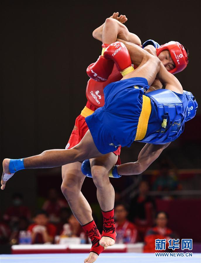 8月22日,中国选手师战卫(左)在比赛中。当日,在第18届亚运会男子散打70公斤以下半决赛中,中国选手师战卫战胜印度尼西亚选手普亚,进入决赛。 新华社记者张金加摄