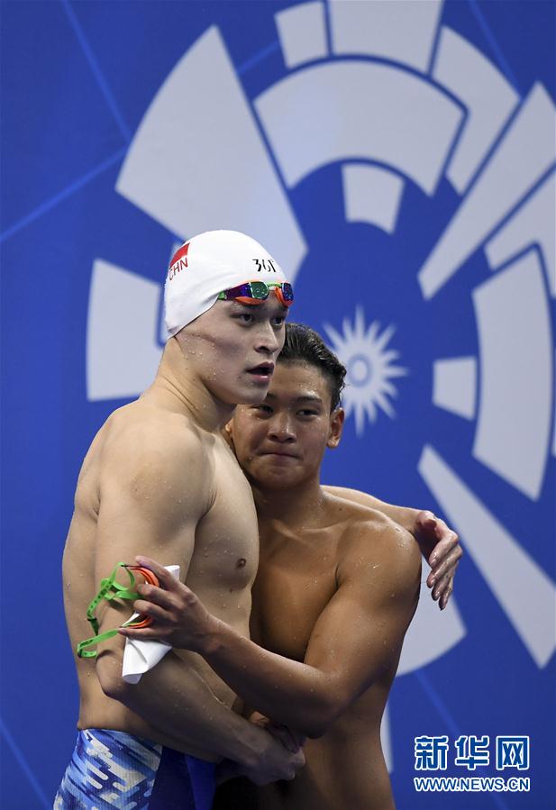 8月22日,中国队选手孙杨(左)在赛后与队友杨金潼相互致意。 当日,在第18届亚运会男子4X100米自由泳接力决赛中,中国队以3分13秒29的成绩获得亚军。 新华社记者岳月伟摄