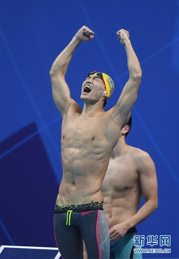 8月22日,中国选手徐嘉余庆祝。 当日,在第18届亚运会男女4X100米混合泳接力决赛中,中国队以3分40秒45的成绩夺冠。 新华社记者潘昱龙摄