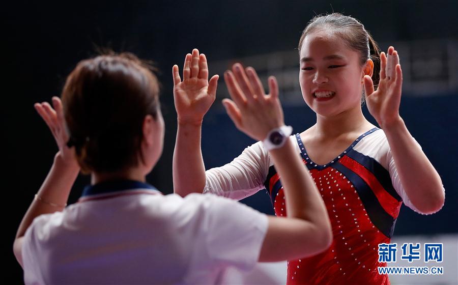 8月23日,韩国选手余瑞婷(音译)在完成女子跳马决赛后与教练庆祝。 当日,在印度尼西亚雅加达举行的第18届亚运会体操女子跳马决赛中,韩国选手余瑞婷(音译)获得冠军、乌兹别克斯坦选手丘索维金娜和朝鲜选手片礼永(音译)分获二、三名。 新华社记者王丽莉摄