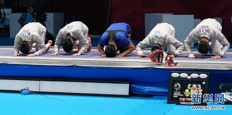 8月23日,韩国队选手和教练在赛道上跪地向看台上的前辈和观众谢恩。 当日,在第18届亚运会男子佩剑团体决赛中,韩国队战胜伊朗队,夺得冠军。 新华社记者王毓国摄