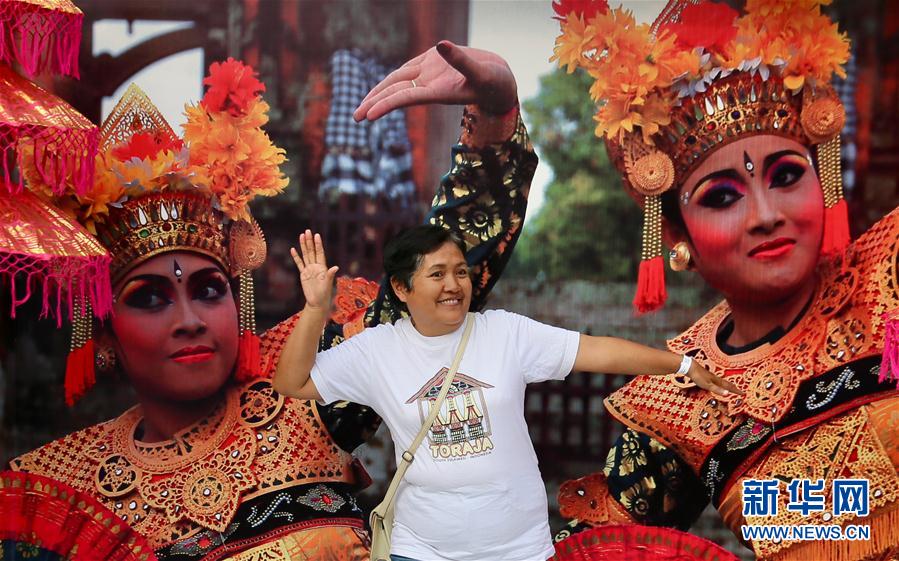 8月25日,印尼大妈在雅加达朋加诺体育中心场馆外的宣传画前拍照留影。 亚运盛会期间,赛场内的运动健儿奋力拼搏。场外的印尼大妈也从附近社区赶来,演奏当地木琴,载歌载舞,欢迎远道而来观看比赛的各地宾客。 新华社记者侯东涛摄