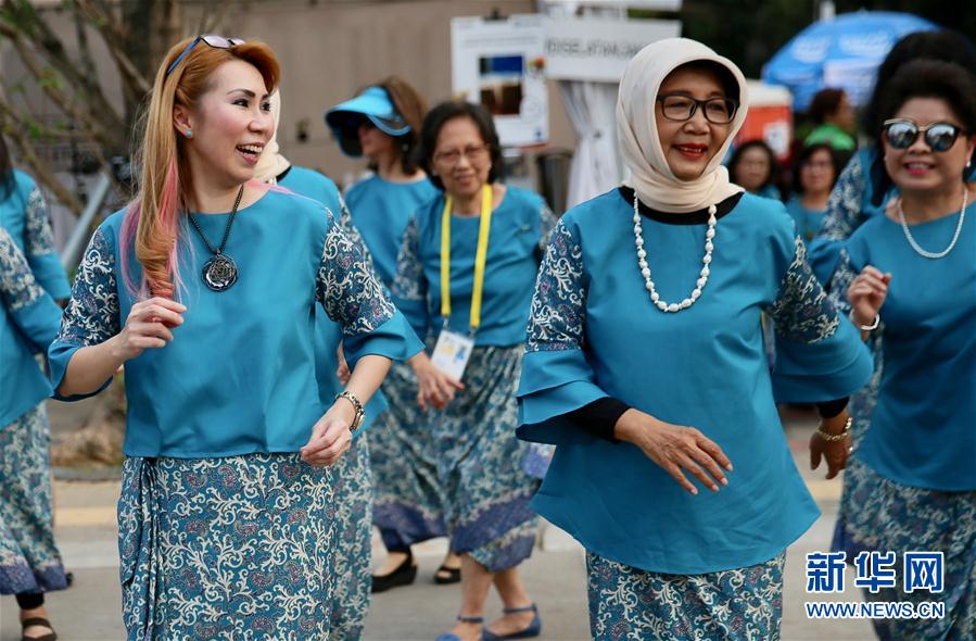 8月25日,印尼大妈在雅加达朋加诺体育中心场馆外表演舞蹈。 亚运盛会期间,赛场内的运动健儿奋力拼搏。场外的印尼大妈也从附近社区赶来,演奏当地木琴,载歌载舞,欢迎远道而来观看比赛的各地宾客。 新华社记者侯东涛摄