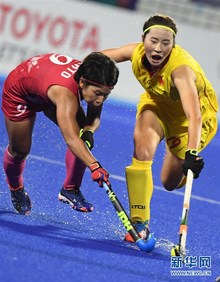 8月25日,中国队29号选手陈艺(右)在比赛中。 当日 ,在第18届亚运会女子曲棍球小组赛中,中国队以2比4负于日本队。 新华社记者李贺摄