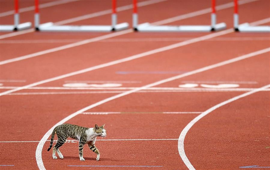 8月25日,一只花猫走进田径场。 当日,在第18届亚运会女子100米栏比赛在雅加达举行。 新华社记者岳月伟摄