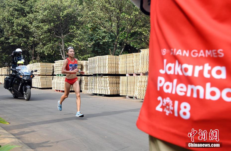 8月26日上午,雅加达亚运会女子马拉松比赛,中国选手张美霞以2小时41分30秒的成绩第八名完赛。图为张美霞在比赛中。中新社记者 侯宇 摄