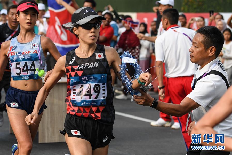 8月26日,日本选手野上惠子在比赛中。 当日,在第18届亚运会女子马拉松比赛中,日本选手野上惠子以2小时36分27秒的成绩获得亚军。 新华社记者潘昱龙摄