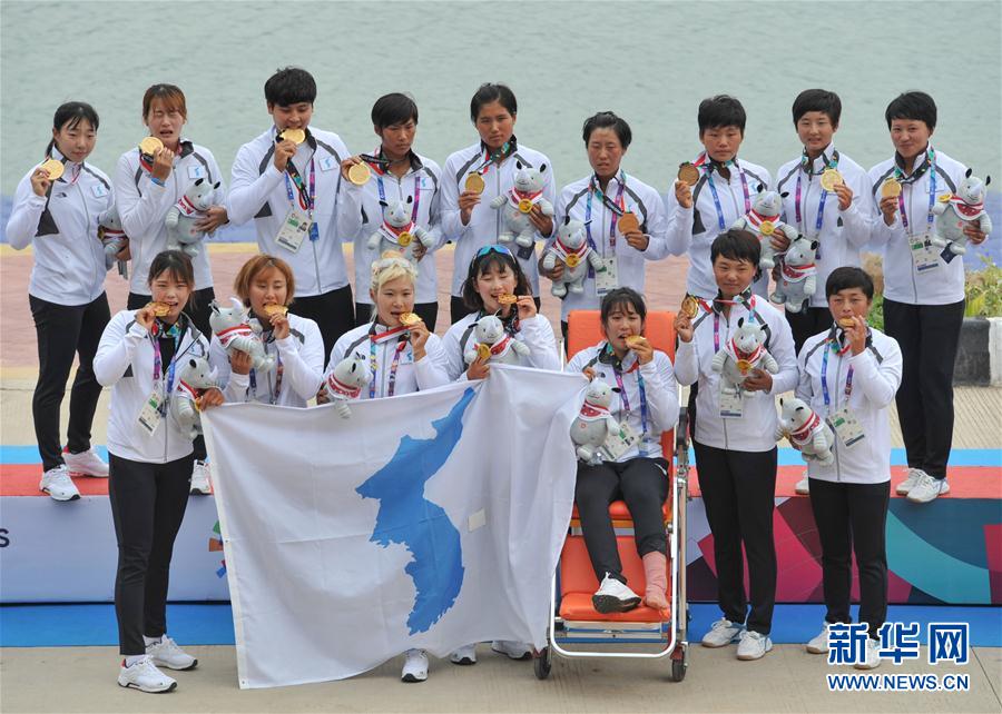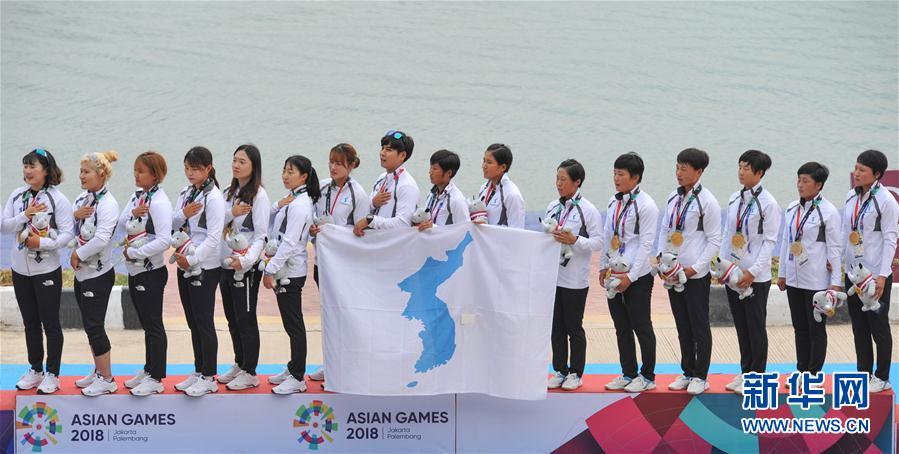 8月26日,朝韩联队运动员在颁奖仪式上。 当日,在印度尼西亚巨港举行的第18届亚运会女子500米龙舟竞速赛中,朝韩联队获得冠军。 新华社发(维里摄)