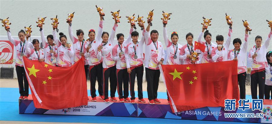 8月26日,中国队在颁奖仪式上。 当日,在印度尼西亚巨港举行的第18届亚运会女子500米龙舟竞速赛中,中国队获得亚军。 新华社发(维里摄)