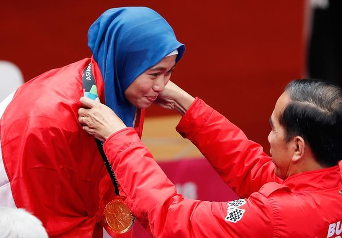 19日,在印度尼西亚雅加达举行的第18届亚运会跆拳道女子个人品势决赛中,印度尼西亚选手德菲亚战胜伊朗选手马里安,获得金牌。
