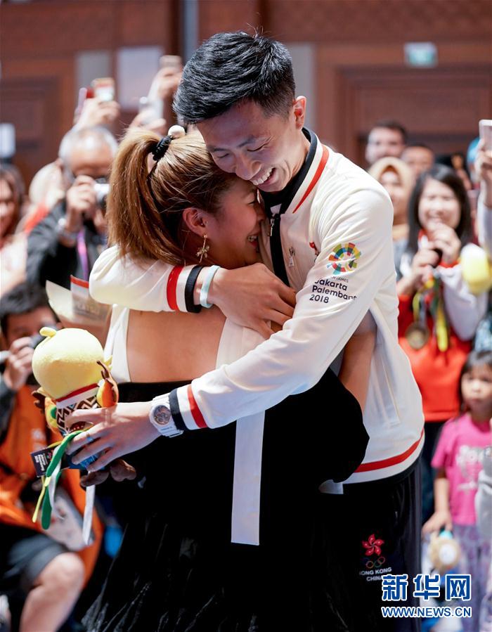 8月23日,中国香港队选手林衍聪(右)向女友求婚成功后拥抱女友。 当日,获得亚运会男子佩剑团体季军的中国香港队选手林衍聪在颁奖仪式后向女友黄嘉宝求婚,并获得成功,给赛场增添了甜蜜色彩。 新华社记者王毓国摄