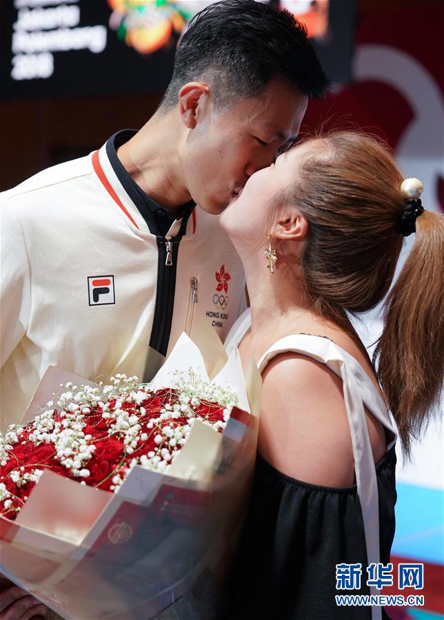 8月23日,中国香港队选手林衍聪(左)求婚成功后亲吻女友。 当日,获得亚运会男子佩剑团体季军的中国香港队选手林衍聪在颁奖仪式后向女友黄嘉宝求婚,并获得成功,给赛场增添了甜蜜色彩。 新华社记者王毓国摄