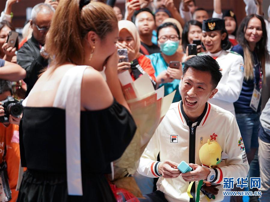 8月23日,中国香港队选手林衍聪(右)在颁奖仪式后向女友求婚。 当日,获得亚运会男子佩剑团体季军的中国香港队选手林衍聪在颁奖仪式后向女友黄嘉宝求婚,并获得成功,给赛场增添了甜蜜色彩。 新华社记者王毓国摄