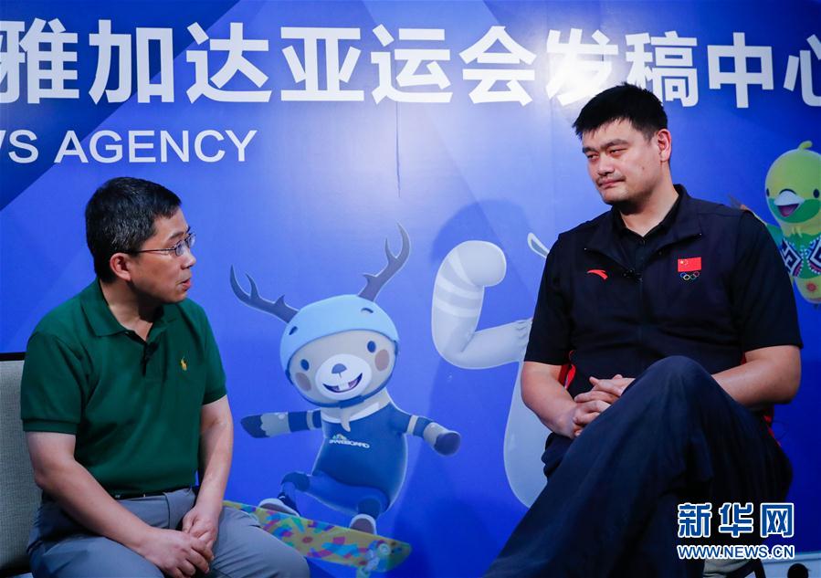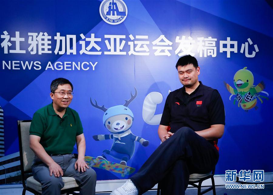 8月30日,姚明(右)在接受采访。 当日,中国篮协主席姚明在新华社雅加达亚运会发稿中心接受了专访。 新华社记者王婧嫱摄