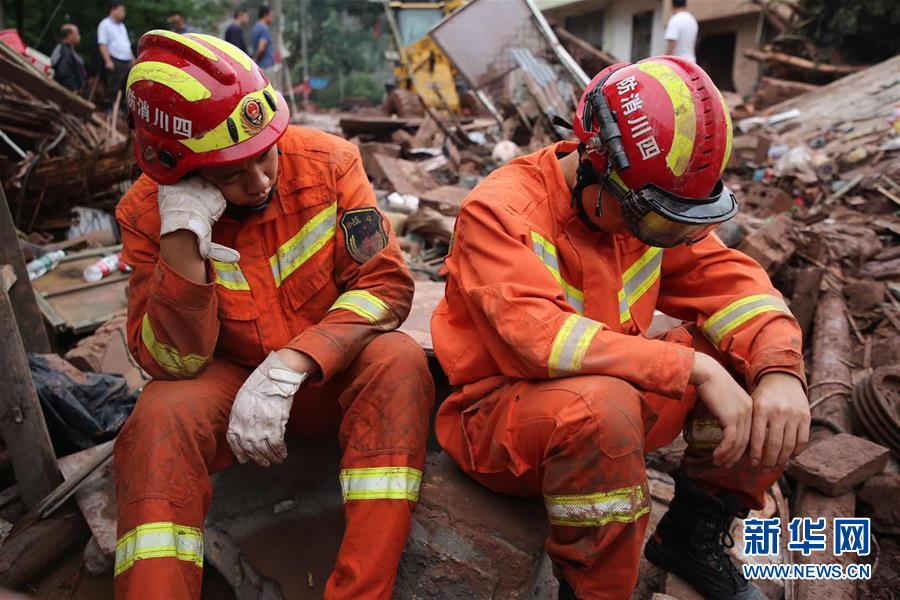 8月11日,雅安市雨城区八步乡,消防员连续搜救十余个小时后在地上休息。 新华社发