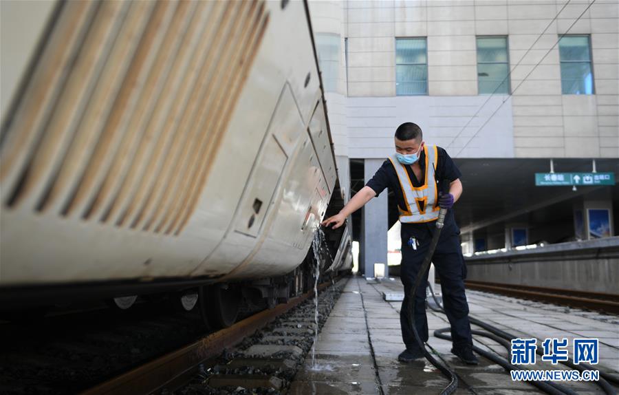 8月12日,长春火车站客运车间上水工龚关在给列车上水。 新华社记者 林宏 摄