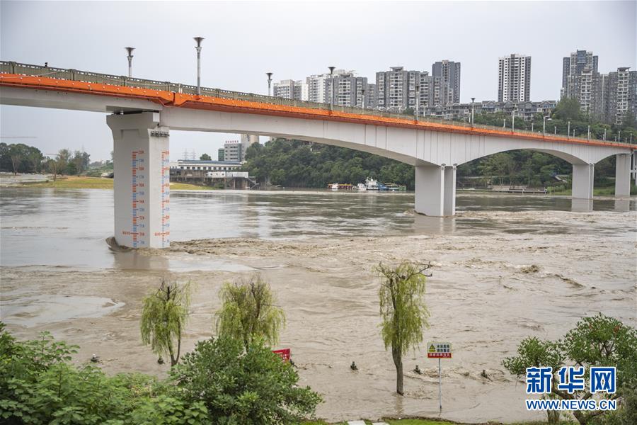8月12日,洪水通过潼南城区。 受强降雨影响,涪江潼南段迎来过境洪水。截至12日下午5时,涪江潼南城区段最高水位238.5米,超警戒水位0.5米,低于保证水位(240米)。此次过境洪水导致潼南区部分场镇低洼地段局部进水,约2700亩农作物不同程度受灾。 新华社记者 黄伟 摄