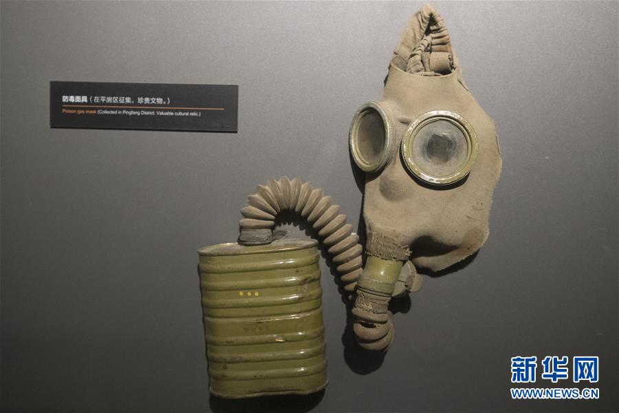 侵华日军第七三一部队罪证陈列馆内陈列的日军防毒面具(8月13日摄)。新华社发(张涛 摄)