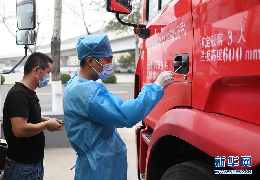 工作人员在新发地批发市场周转新区对进场车辆进行取样(8月6日摄)。 新华社记者 张晨霖 摄