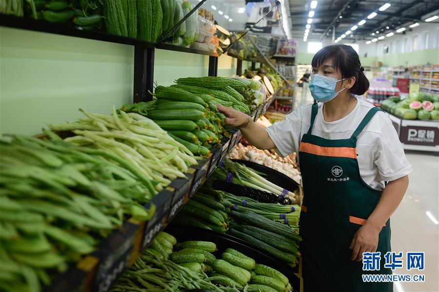 8月15日,新发地农产品批发市场外新设置的便民超市的工作人员在整理货架上的蔬菜。 新华社记者 彭子洋 摄