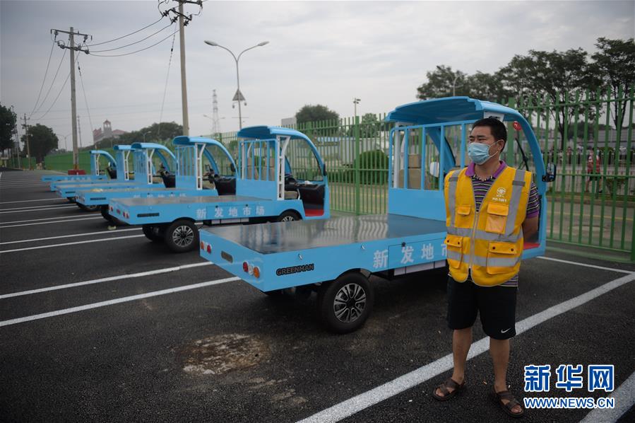 8月15日,北京新发地农产品批发市场内用于转运货物的电瓶车停泊整齐。 新华社记者 彭子洋 摄