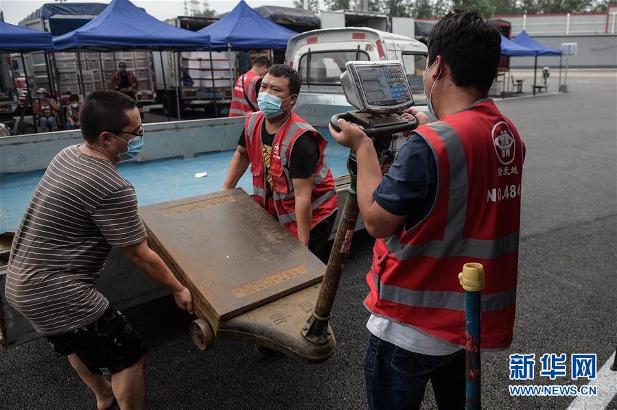 8月15日,北京新发地农产品批发市场内,商户在搬运电子秤。 新华社记者 彭子洋 摄