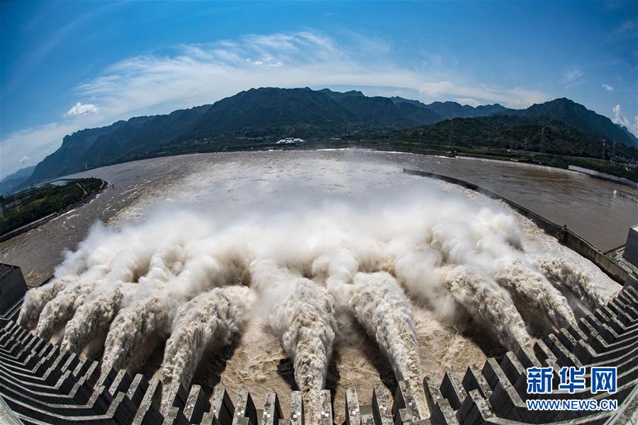 8月19日拍摄的开启泄洪深孔泄洪的长江三峡水利枢纽工程。 新华社发(郑家裕 摄)
