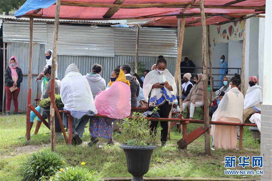 8月17日,戴着口罩的当地民众在埃塞俄比亚首都亚的斯亚贝巴附近的蒂鲁内什-北京医院内候诊。 新华社发(迈克尔·特韦尔德摄)