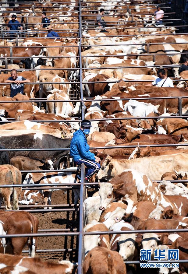 一位牧民在科左中旗成峰牲畜交易市场等待出售养殖的黄牛(8月19日摄)。 成峰牲畜交易市场位于内蒙古通辽市科左中旗舍伯吐镇,黄牛年交易量超过80万头。2019年北京顺义区挂职扶贫干部协调京蒙帮扶项目,北京市和顺义区为成峰牲畜交易市场注入扶贫资金500万元,扶持市场与周边贫困农牧民签订合作协议,通过小额信用贷款支持、免费提供暂养场所、免除交易管理费用等多项综合扶贫措施,让当地贫困农牧民们通过养殖销售黄牛脱贫。 新华社记者李欣摄